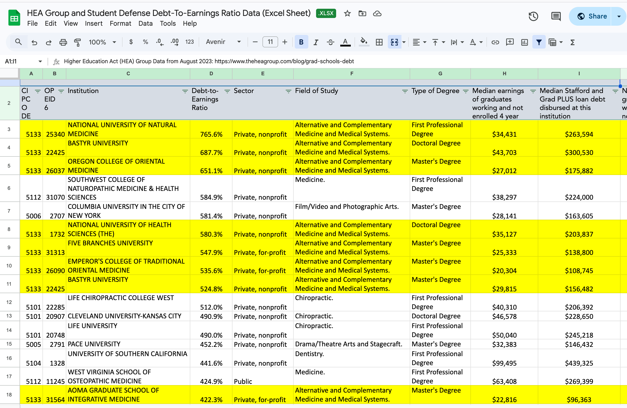 Since 2023, I’ve been citing the debt-to-earnings (DTE) data that was published by the HEA Group. That data is incredibly important because when it is sorted by the DTE column, you can see that: